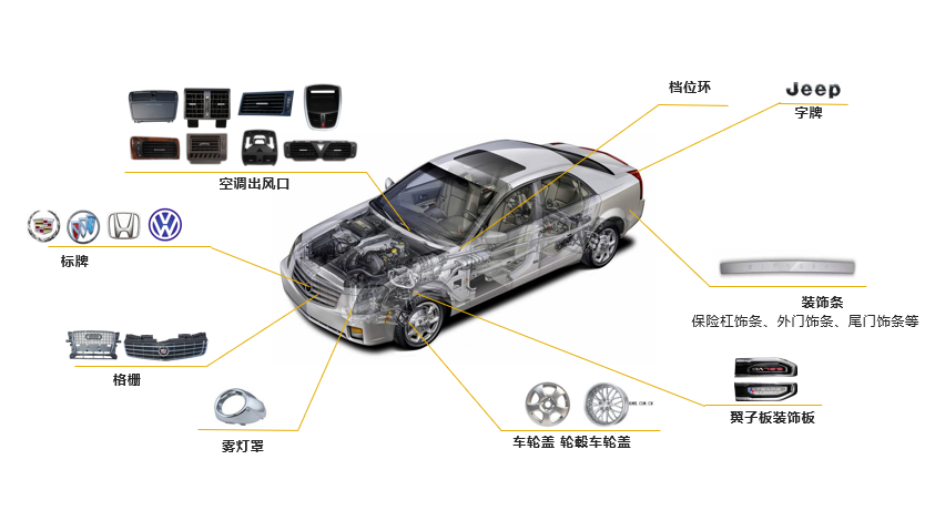 The company continuously optimizes its product structure and market structure. At present, automotive signage and radiator grilles are leading the industry in the domestic passenger car market. They are GM, Ford, Fiat-Chrysler, Volkswagen, Mercedes-Benz, Honda, Hyundai Kia, Toyota, Nissan, First-tier supporting suppliers of well-known domestic and foreign automobile manufacturers such as Geely, Great Wall and Chery.