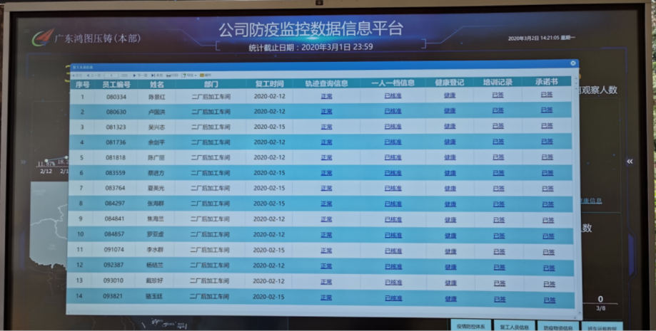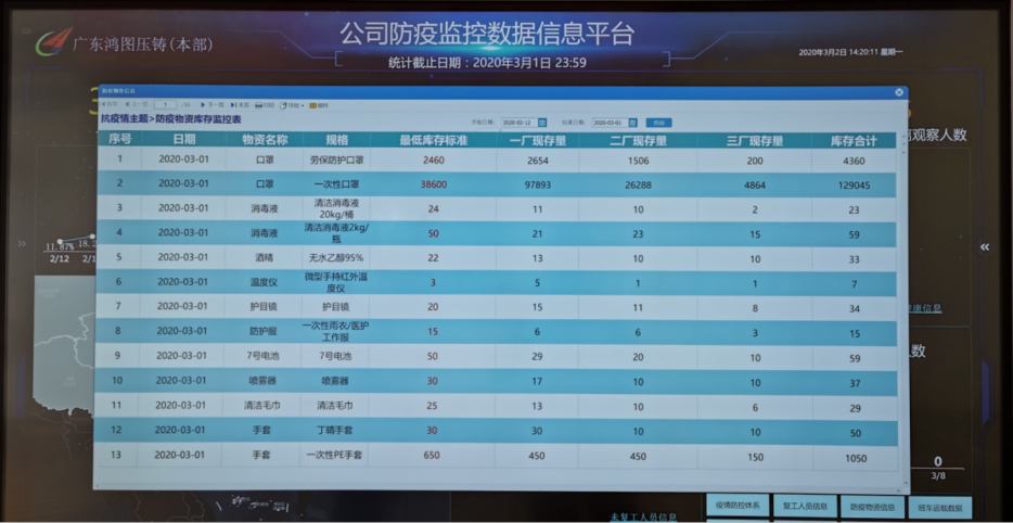 Hence, the Information Technology Team redesigned and developed the data & information monitoring platform for epidemic prevention and control, so as to achieve the integrated application of monitoring, management and decision making. This platform can not only integrate data about staff's travel, dining, foreigner control as well as the inventory monitoring of epidemic prevention & control materials, but also reflect the company's returned worker ratio, staff household distribution, daily staff health and situation of those in quarantine, moreover, it can transfer returned staff's archival information and monitor the shifts and travel situations in a real time manner. Besides, it can also assist HR Department to connect through "three forms and one statement" of returned workers, the list of those unreturned, and the daily information of staff health, etc.