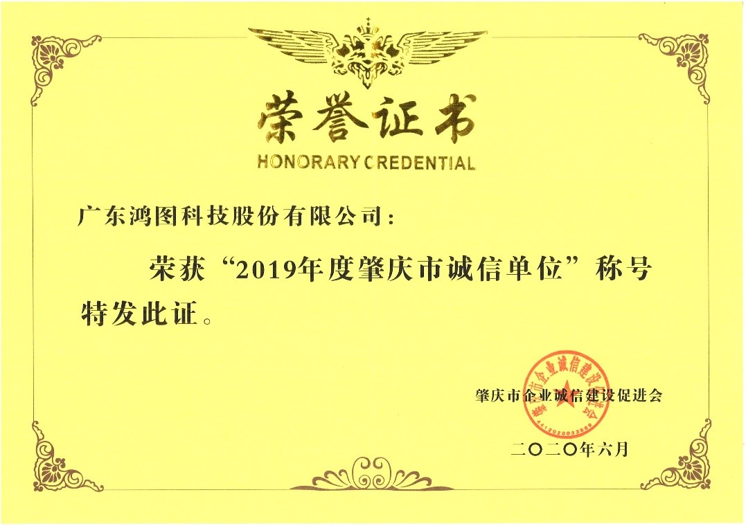 On June 12, Zhaoqing Enterprise Integrity Promotion Association held an event in the theme of "Advocating Integrity, and Setting up Advanced Example", on which Hongtu Technology was awarded the title "2019 Credible Enterprise of Zhaoqing City".