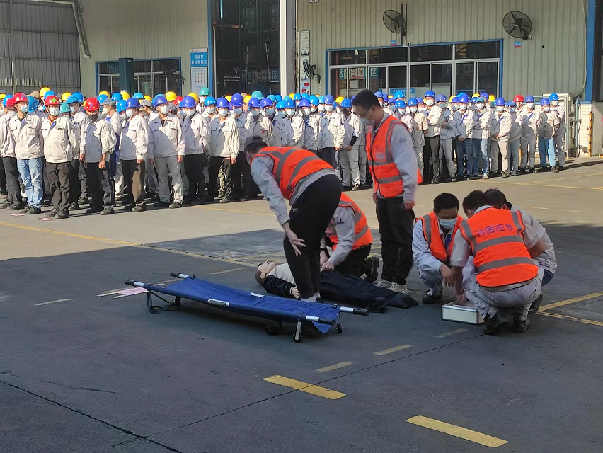 下午15點整,公司黨委書記、董事長、應急實戰演習總指揮但昭學下達演習開始命令,演習正式開始。本次演習模擬了兩處火災險情。情景一模擬公司中試車間液壓油管破裂引發火災。在第一時間報警的同時,公司安全負責人迅速部署搶險工作,組織營救傷員,安排叉車隊轉移車間入口處的貨品,并對阻礙救援的車間鐵門進行破拆。肇慶市消防救援支隊高要大隊消防人員抵達后,順利進入火災現場實施滅火,同時抵達的醫護人員立即對模擬昏迷傷員展開救治。通過多方協同作戰,火情得到迅速撲滅,傷員得到及時救治。