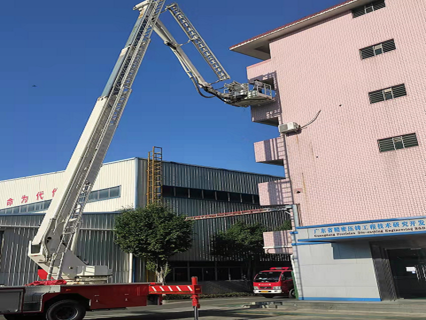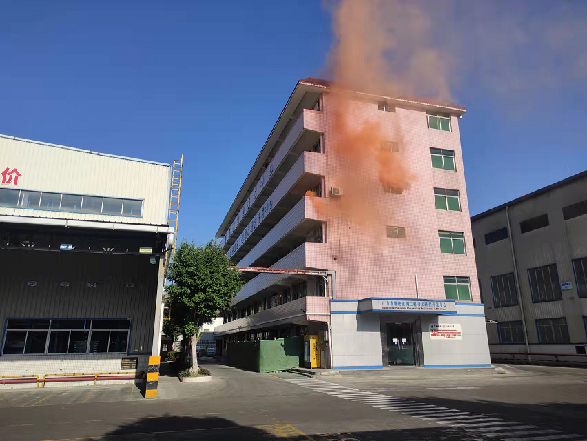 情景二模擬公司科研樓四樓因電線短路造成火災。現場人員第一時間報警,并使用干粉滅火器對起火點滅火。在火險警鈴響起后,各部門組織員工有序撤離到安全區域,整個過程僅用時1分56秒。消防人員抵達現場后,通過云梯成功將被困人員救出,并迅速控制火情。